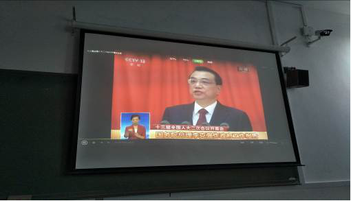 3月7日上午土木与建筑工程学院17装饰班的学生自行组织在教室观看十三届全国人大二次会议开幕式视频。