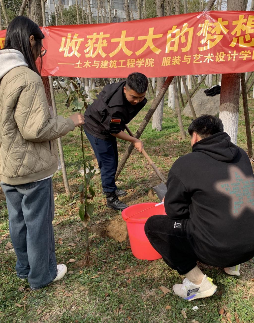 春回大地,绿意盎然。3月12日,土木与建筑工程学院学生在学校银杏苑旁空地上开展以“青春志愿行 奋进新征程”为主题的植树活动。