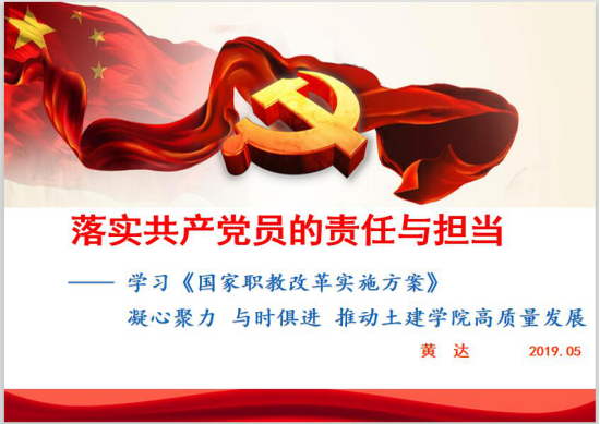 2019年5月15日下午,土木与建筑工程学院党总支书记、院长黄达在1220会议室讲党风廉政党课。黄达书记以《不忘初心 共筑匠心 落实共产党员责任担当》为主题,结合《国家职业教育改革实施方案》(简称“职教20条”)颁布的背景、意义、总体要求与目标,逐条详细介绍了完善国家职业教育体系、构建职业教育国家标准、促进产教融合校企“双元”育人等七大方面共20条实施细则,并对推进高等职业教育高质量发展、多措并举打造“双师型”教师队伍、启动1+X证书制度试点、坚持知行合一、工学结合、推动企业和社会力量举办高质量职业教育等与学院建设发展密切的相关内容进行了重点解读。