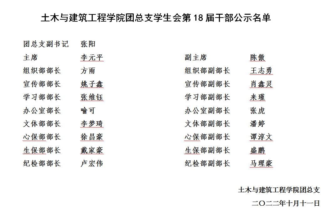 此次参加竞选的干事就本人基本情况、岗位认识、竞选优势及工作规划等方面进行了陈述。随后,各位老师及干部进行讨论并总结,确定第十八届学生会干部共计19人。名单如下: