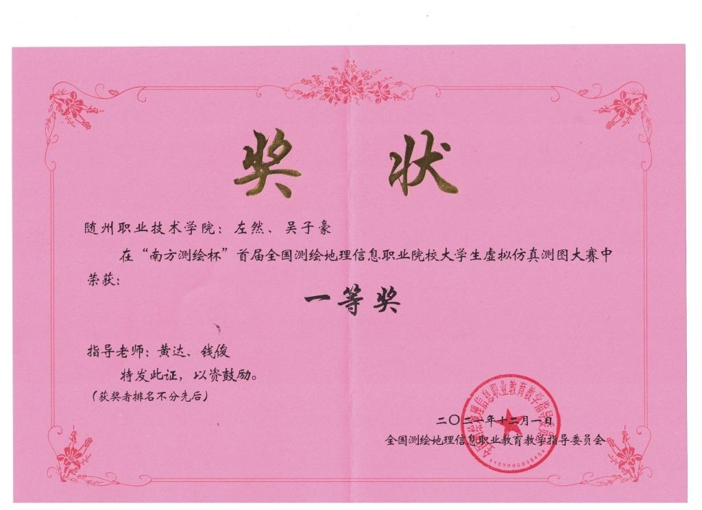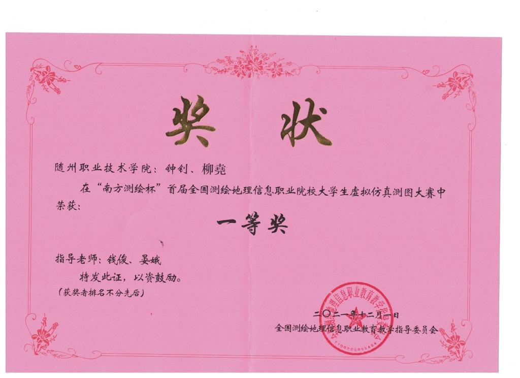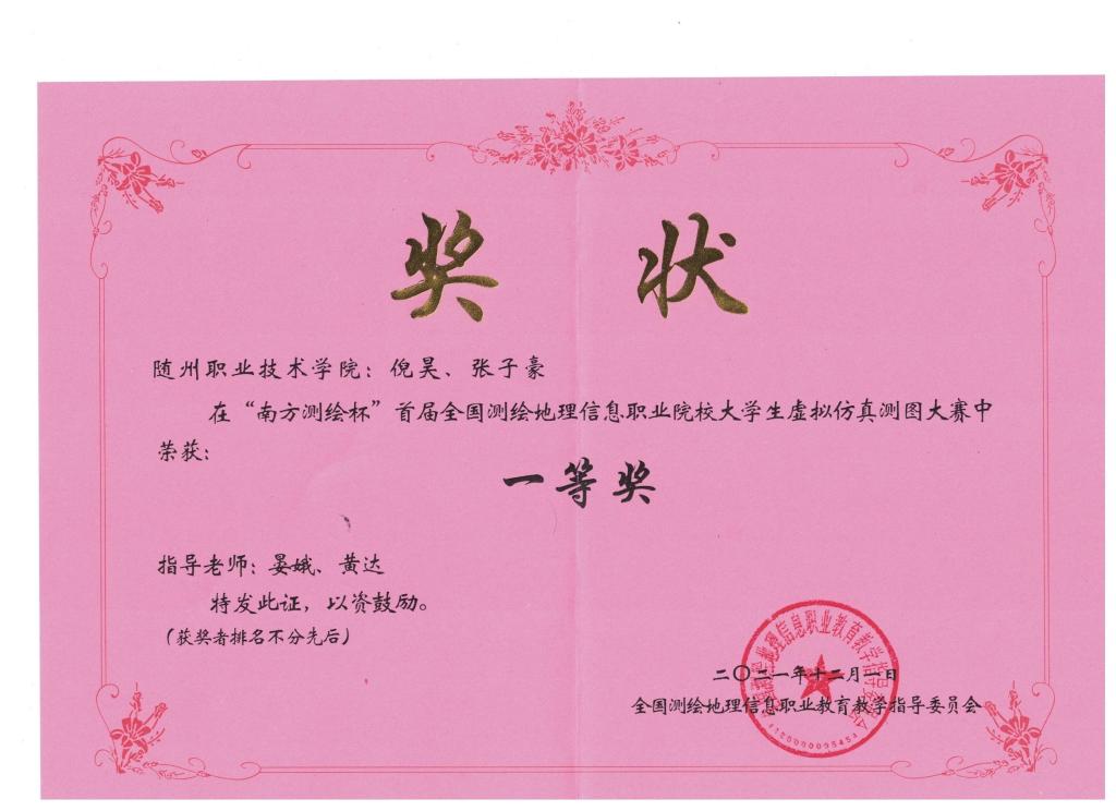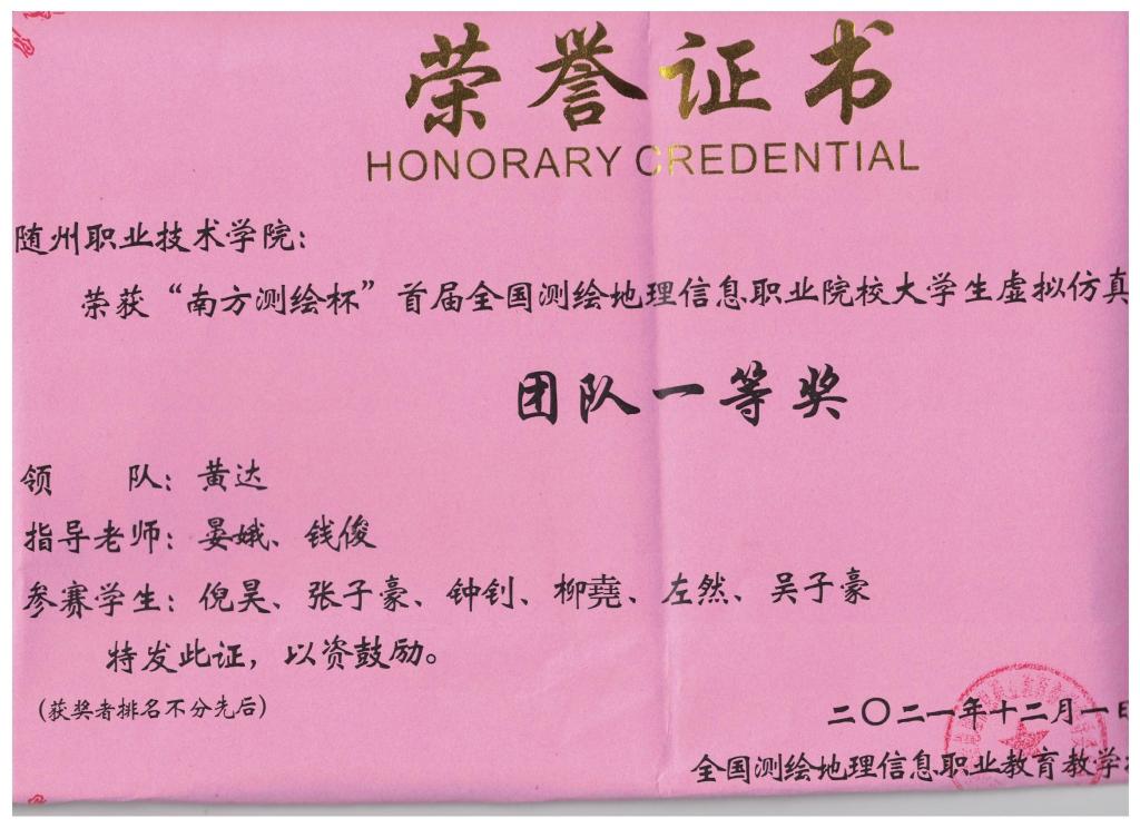 2021年受新冠肺炎疫情影响,湖北省内各类官方比赛相继告停,土建学院教学团队另辟蹊径,积极融入各类行业协会比赛,在“南方测绘杯”首届全国测绘地理信息职业院校大学生虚拟仿真测图大赛中迎来开门红,荣获三个单项一等奖、团体一等奖的好成绩。