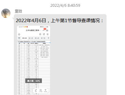 为加强线上教学督导,确保教学质量。土建学院成立专门的线上教学督导小组,每半天安排督导专员线上查课,实时反馈督查结果,推进在线教学工作,切实保障线上教学质量。