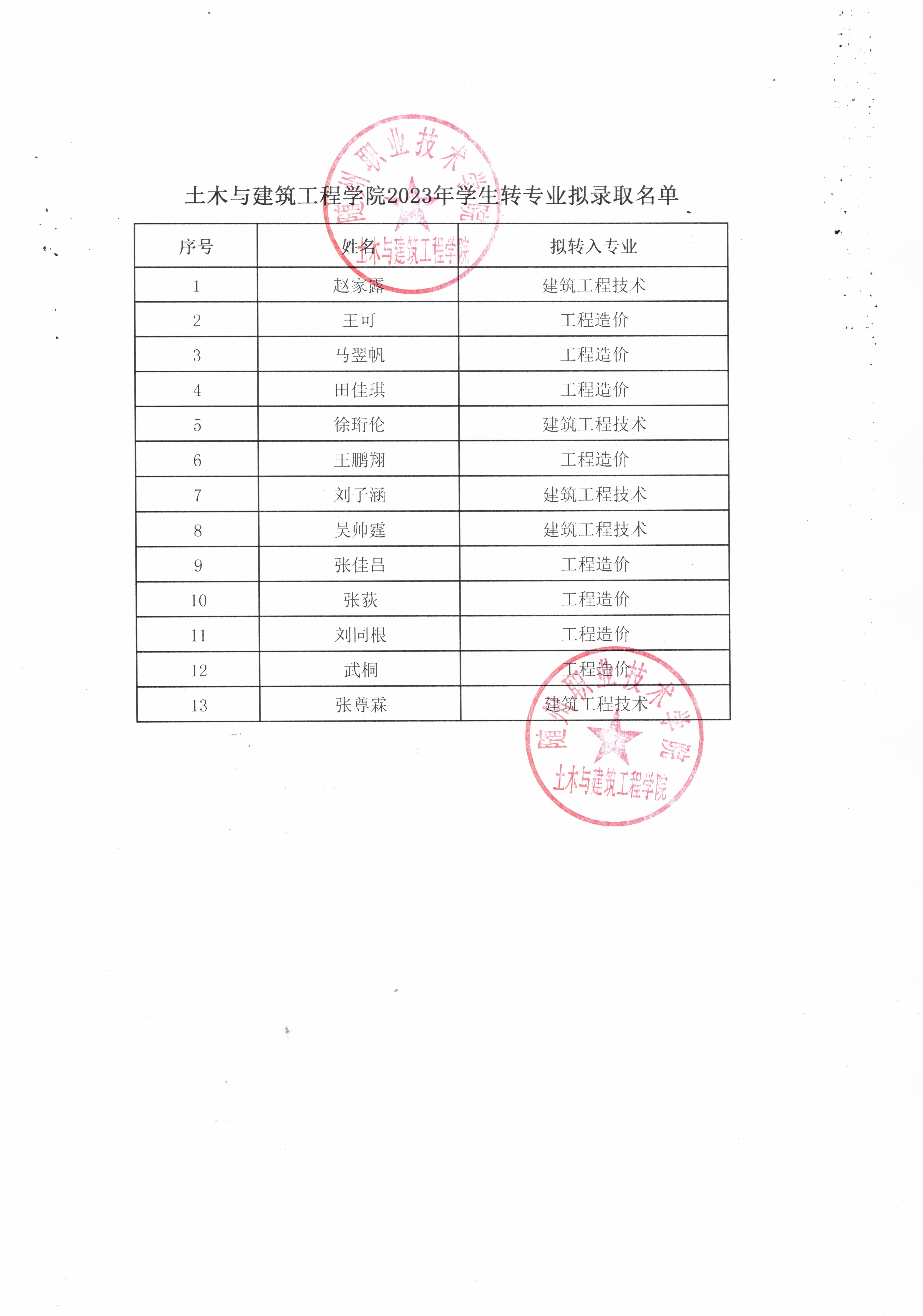 土木与建筑工程学院2023年转专业录取名单公示