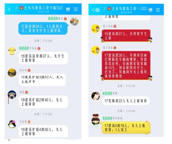 疫情期间,学工办以全体班主任和辅导员为主力军,以班级群、微信群等为防疫控疫阵地,每天关心关爱学生,提醒学生日报平安。辅导员对负责的班级学生开展网格化管理模式,发挥班级干部力量,确保既有重点,又全覆盖。