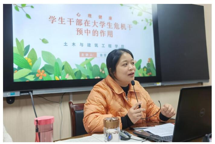 2021年12月6日晚,土木与建筑工程学院在思成楼1107会议室开展了《学生干部在心理危机干预中的作用》会议。由学生工作办公室主任徐慧子主持,党总支部副书记、21级新生班主任级21级全体寝室长和班委参会。