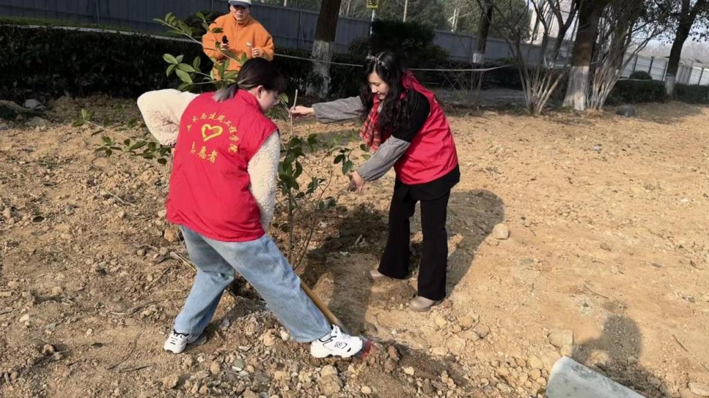 挥锹铲土、扶苗填坑、提桶浇水……志愿者们分工协作,配合默契,新植的树苗迎风挺立,在春日的阳光下焕发出勃勃生机,为校门口增添了一道靓丽的风景线。