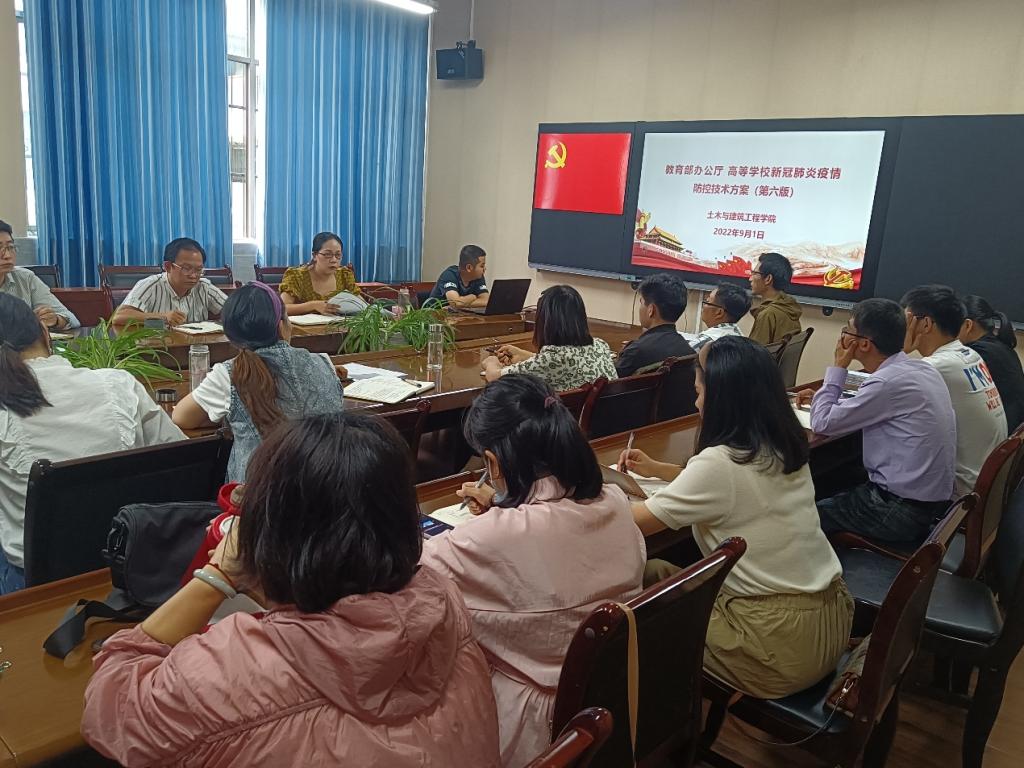 9月1日下午,土木与建筑工程学院召开新冠疫情防控技术方案(第六版)工作会议。会上,党总支副书记张丽传达了学校防疫工作精神,带领全体教师学习《教育部办公厅 高等学校新冠肺炎疫情防控技术方案(第六版)》相关内容,指出我院关于常态化疫情防控形势下教学实施和学生服务的工作重心和方式方法,要求全体教师务必从思想上高度重视,行动上严格落实,纪律上克服麻痹。各位班主任结合当前疫情防控工作指示,对本班学生分布和返校前疫情防控工作落实情况进行了全面的梳理和汇报。