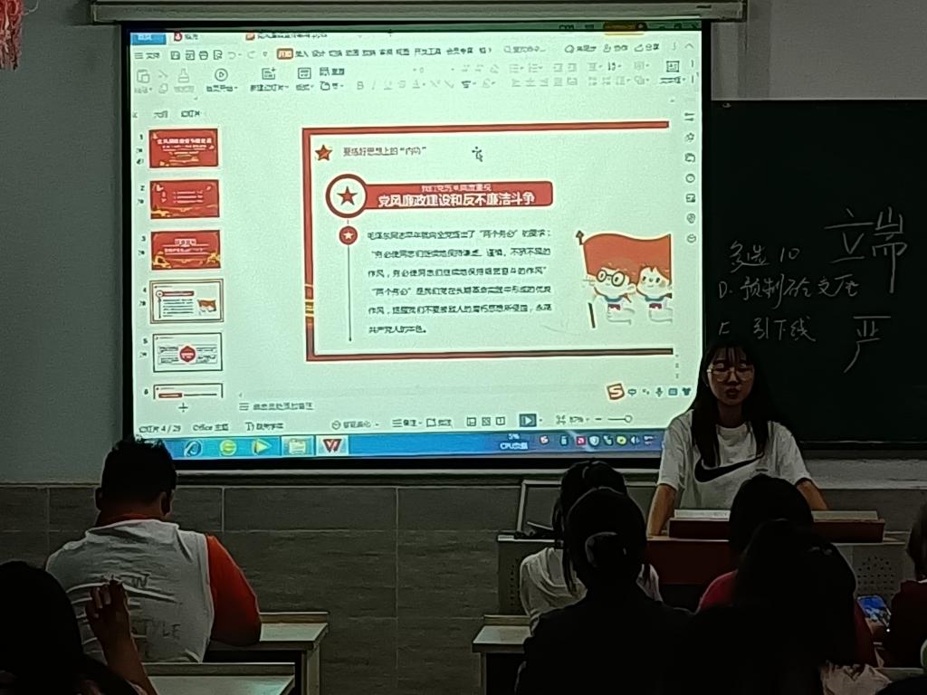 20建筑班班主任党员教师童晗讲到,党风廉政建设是党的重要组成部分,它直接关系到党的形象和战斗力和凝聚力;直接关系党与人民群众的血肉联系和人心向背;关系到民风和社会风气能否好转;关系到党和国家的生死存亡;20造价班班主任党员教师周阳通过练好“三功”, 号召师生应当树立良好的思想意识,建起牢固的思想防线,只有思想牢固,才能不被所谓的“感情关系”攻破廉政的堡垒;21建筑班班主任党员教师张铁聍通过典型案例,告诫同学们要坚定理想信念,更要筑牢拒腐“防线”;要坚守廉洁“底线”,更要远离高压“红线”;要作改革的先锋,更要作廉洁从政的表率。要求班委干部、入党积极分子要按照党章的要求加强自我教育、自我锻炼、自我完善,自觉用党性原则对照自己的一言一行,严格要求自己,经常反省自己,不断升华精神境界,提高党性修养给班上同学做好榜样。