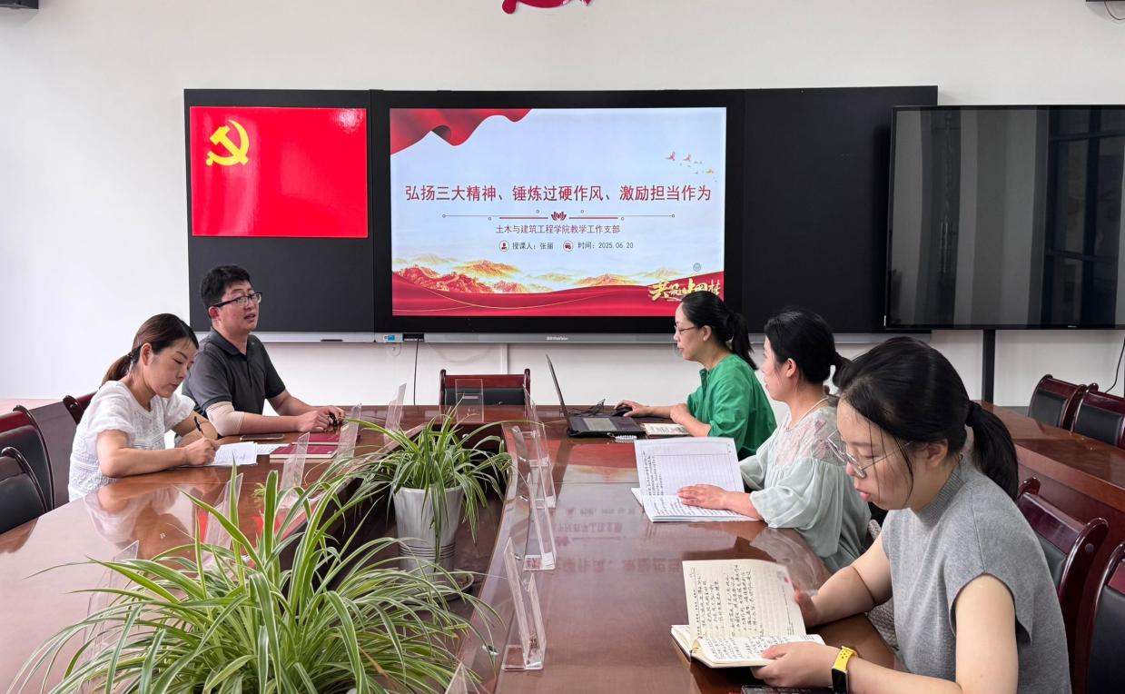 为深化党员教师思想政治引领,土木与建筑工程学院于6月20日组织开展专题支部主题党日活动。学院教工支部书记张丽、学工支部书记徐慧子分别在1107会议室讲党课,围绕“弘扬三大精神、锤炼过硬作风、激励担当作为”主题,通过历史回溯与现实观照相结合的方式,系统阐释了大别山精神坚守信念的革命品格、抗洪精神众志成城的担当本色、抗疫精神生命至上的价值追求。党课立足教师职业特性,深入探讨如何将三大精神内核转化为立德树人的实践动能,引导党员教师在教学科研、服务育人中强化责任担当。